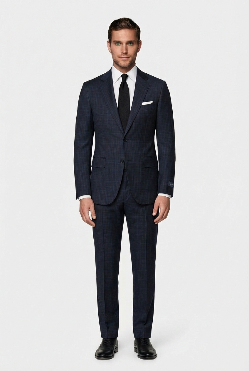 • Костюм приталенного силуэта из шерстяной итальянской ткани REDA super 130s. Пиджак однобортный, две шлицы. Застежка на две пуговицы. Воротник классический, отложной, на лацкане имеется фасонная петля. Край лацкана, воротник, клапаны декорированы отделочной строчкой «вспушка» (имитация ручного стежка). Два боковых кармана с клапанами, нагрудный карман «листочка». Рукава со шлицами, на четыре пуговицы пришитых внахлест расстегиваются (рабочая шлица) как у всех дорогих брендов. Четыре внутренних кармана, один застегивается на пуговицу. Брюки приталенного силуэта, два боковых кармана, два задних кармана с застежкой на пуговицу, на поясе предусмотрены шлевки для ремня.