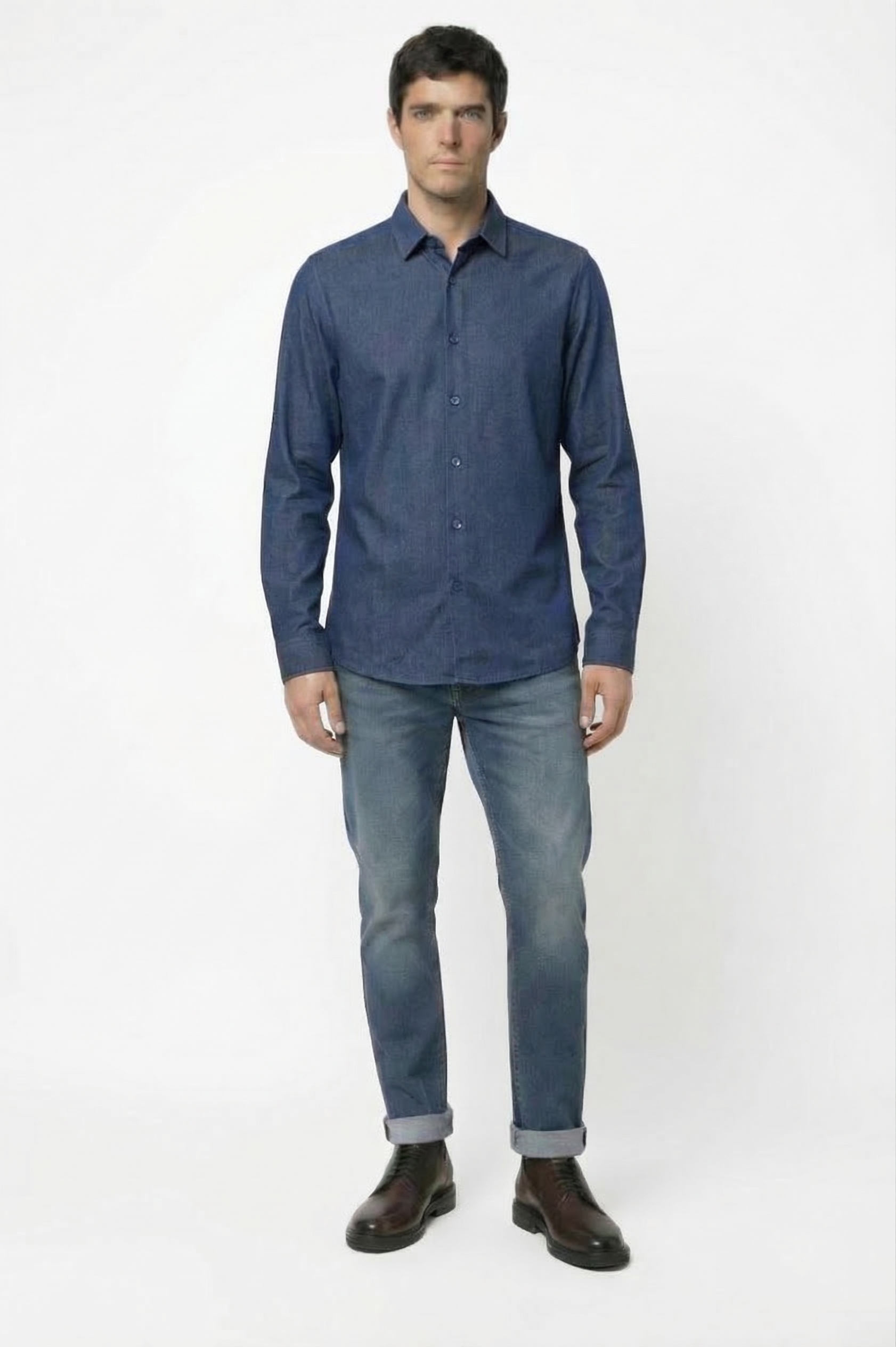 Универсальный цвет легко сочетается с джинсами, брюками и пиджаками, позволяя создавать современные образы. Рубашка полуприлегающего силуэта, не сковывает движения и выглядит аккуратно как навыпуск, так и заправленной. Длинный рукав и классический отложной воротник делают модель практичной и всесезонной. Застежка на пуговицы.
