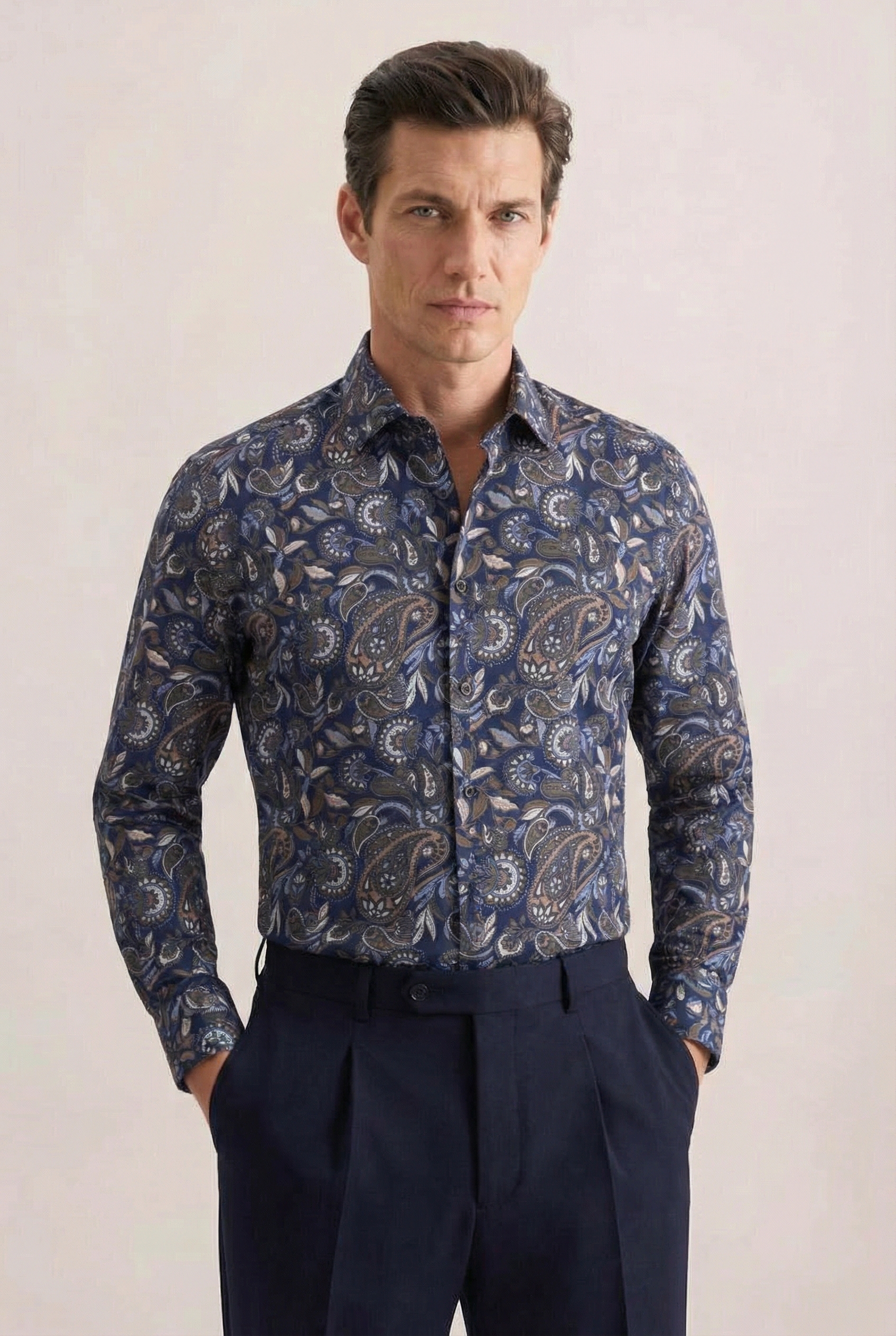 • Приталенный силуэт, Классический воротник, Классический (на пуговице), Принт, Синий